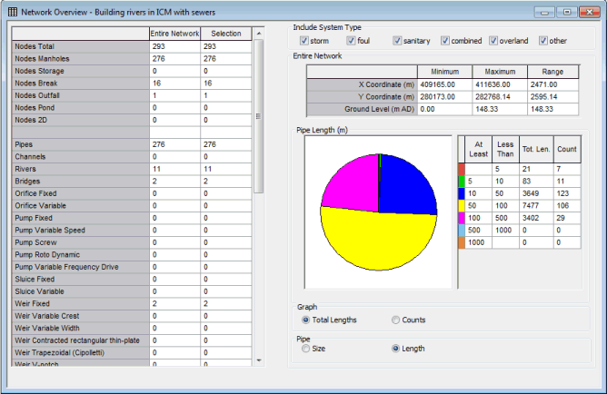 The left hand side of the view displays a summary of the entire network. If there is a current selection, an additional column is added containing a summary of the objects in the selection.