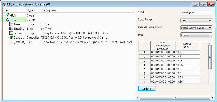 The example below shows the RTC for a sluice gate indirectly controlled by the height above datum at node 120. The required heights for node 120 are specified in Table 'TimeInputs'. A Controller is then used to operate the sluice gate in order to maintain these heights.