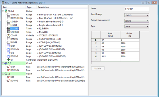 The following example of Real Time Control compares the volume in two tanks and regulates the discharge from these tanks so that a maximum flow is not exceeded.