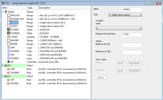 Condition: DOWNDRule type: CTRL Controlloer: UP Setpoint type: FIXED -0.010m3/s |