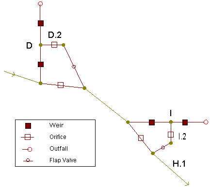 Under this scenario, the flow in conduit H.1 and the levels in tanks D and I are monitored. The volume in Tank D and Tank I is calculated by use of tables, and the difference between the volumes is calculated by use of a Variable. The orifices on the outlet to Tank D and on the outlet to Tank I are controlled incrementally depending on the magnitude of flow in conduit H.1 and which tank contains greater volume: