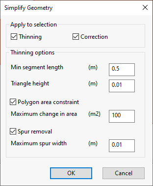 This dialog is used when simplifying polygon and polyline geometry data. It enables you to select thinning and correction options for a selection of polygon and subcatchment objects, and is displayed by selecting GeometrySimplify from the Model menu.