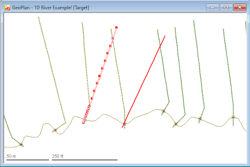 Two cross section lines that intersect the same river reach link (shown in red) are selected on the GeoPlan. The intermediate points and vertices are highlighted on the left line.
