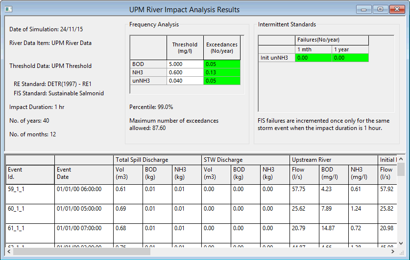The Frequency Analysis table shows the thresholds set for BOD, total ammonia (NH3) and un-ionised ammonia (unNH3). (See UPM Threshold Data - River Ecosystems View.) For each of these, the table shows the number of exceedances per year occurring during the test. The table cells are coloured green if the number of exceedances is acceptable or red if it is not. You can change the thresholds in the table, and the number of exceedances will be recalculated.