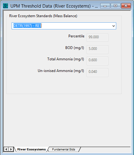The River Ecosystems tab on the UPM Threshold Data dialog allows you to inspect the mass balance frequency analysis thresholds for five fixed environmental standards. You may also enter one set of user-defined thresholds for each UPM Threshold item.
