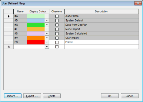 User Defined Flags dialog allows you to set up your own data flags. Network object data fields can be assigned a data flag indicating, for example, where the data came from or how reliable you consider it to be.
