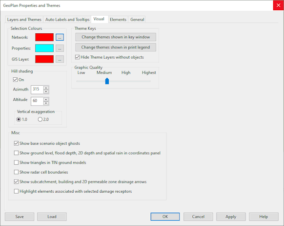 This page of the GeoPlan Properties dialog controls visual effects on the GeoPlan Window such as selection colour, hill shading settings, theme keys and theme graphic quality.