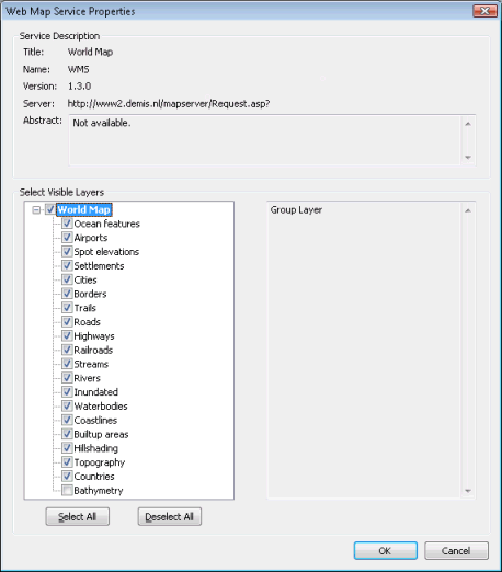 Use this dialog to view the display properties for the selected Web Map Service (WMS) layer. Visibility of layers can be edited in this dialog.