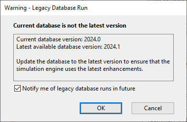 If checked (default), this dialog is displayed every time you run a simulation for a database with an older database version than the latest one. If unchecked, the dialog will not be displayed again. |
