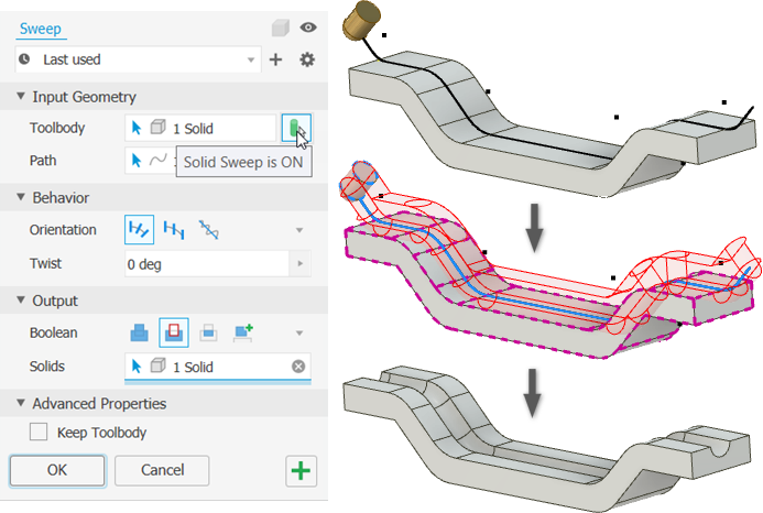 In addition to the property panel, the Sweep command now supports sweeping a solid.