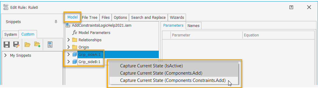 Step 2 In the assembly file, in the Edit Rule dialog box on the Model tab, multi-select the part names, right-click, and then select Capture.Current.State (Components Constraints.Add) from the context menu. |
