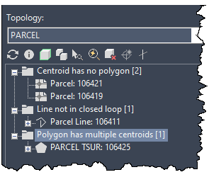 The Area Topology Checker dialog box lists all detected topology errors in a feature explorer.