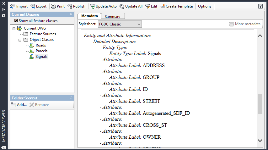 If a drawing contains classified objects, its , metadata is automatically generated and displayed when you open the Metadata Viewer the first time.