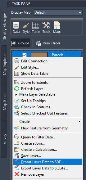 - In Display Manager, right-click the Parcels layer and click Export Layer Data To SDF.