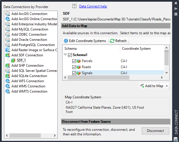 In this exercise, you connect to the new SDF file you created and see the feature classes that were created from the three object classes.