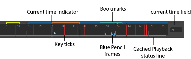 Key Ticks are red (by default) marks in the Time Slider that represent the keyframes you set for the selected object. When keys are selected, they appear white while highlighted blue (see Selecting keys on the Time Slider for an example). Breakdown keys are a special type of key displayed as green marks in the Time Slider.