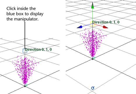 Click inside the blue box. A manipulator identical to the Move tool appears. Drag the center to move in all directions, or drag one of the arrows to move with directional constraint. This manipulator appears only for directional point emitters.