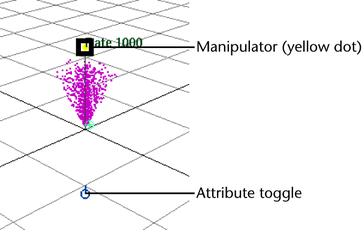 A yellow attribute manipulator appears next to the emitter object. Dolly towards the manipulator to get a clearer view. Initially the attribute manipulator controls the Rate setting. An attribute toggle also appears near the emitter. It controls which attribute you can manipulate.