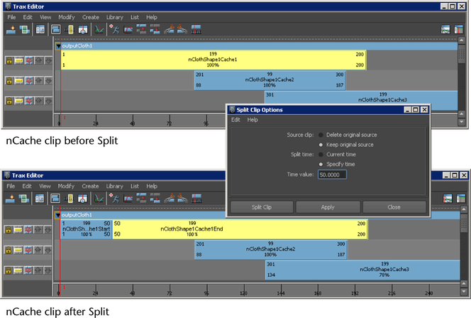 The nCache clip is split according to the current settings in the Split Clip Options window, and two clips appear replacing the selected cache clip. See Split in the Trax Editor Edit menu.