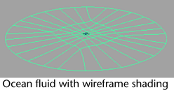 An ocean is defined by a flat surface with an ocean shader assigned to it. Fluid Effects simplifies the process of creating an ocean by providing a single command that creates a plane that is optimized for best results and an ocean shader, with appropriate connections.