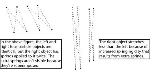 After you create springs on an object, you can add or remove selected springs to tune the spring effect. This is useful if you need to add a few more springs to an object between points previously without springs. You can also add two springs to the same pair of points to increase rigidity. A single stiff spring has an attractive force that differs from two springs set less stiffly.