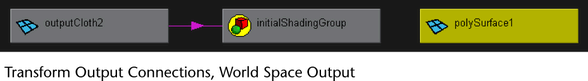 The output connections of the Transform node are dependent on the space output of its nCloth. If your nCloth has Local Space Output, both its input and output meshes share the same Transform. Also, the nCloth’s input mesh moves and follows its output mesh when the output mesh is transformed.