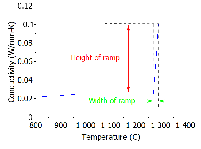 Marangoni convection occurs in the melt pool during welding and additive processes, wherein the advection of the molten material incurs a large amount of convective heat transfer. In the Local Simulation thermal model this behavior cannot be captured directly as it is purely a solid model. However, following the advice of Goldak et al [1], this can be approximated by using a very high thermal conductivity for temperatures in the liquid phase. This is typically done by multiplying the highest temperature conductivity and setting it at or near the solidus temperature. This card automatically applies the Marangoni Convection approximation at a temperature offset r1 below the Solidus temperature in the *LATE card, multiplying the highest temperature conductivity by r2. The effect on the conductivity is illustrated in the figure below. This effect is only applied during the generation of PRMs of type Hot Spot and Lack of Fusion.