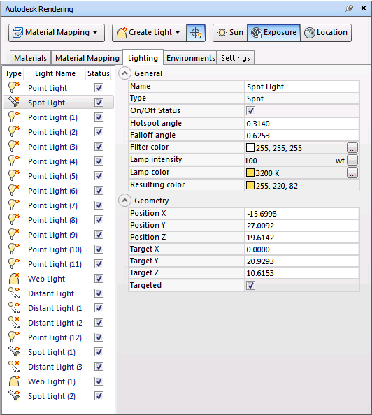Geometry properties control the location of the light. If the light is a spot light, or web light additional target point properties are available.