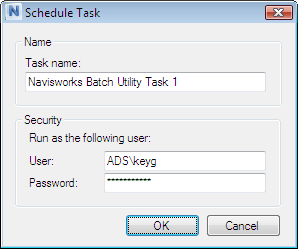 In the Schedule Task dialog box, change the task name, if required, and enter your user name and password. Click OK.