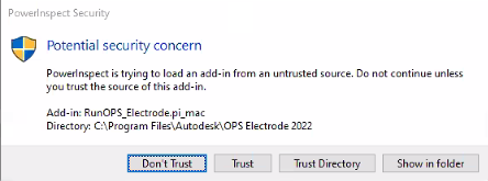 PowerInspect checks for any potential security concerns when an action is driven by the PowerInspect automation interface, for example, when loading add-ins. If there are any security concerns, such as an untrusted source, PowerInspect prompts you for permission to continue: