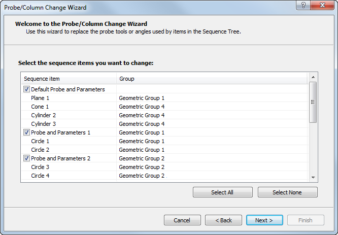 Next. Page 3 of the wizard lists the Probe and Parameters items that use the column and probe tool combination you selected, and the inspection items that use those Probe and Parameters items.