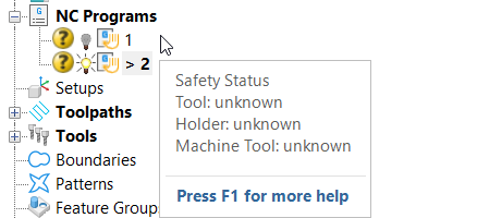 The Explorer displays the issues and warnings associated with NC programs. Hover over the NC Program to display the Safety Status.