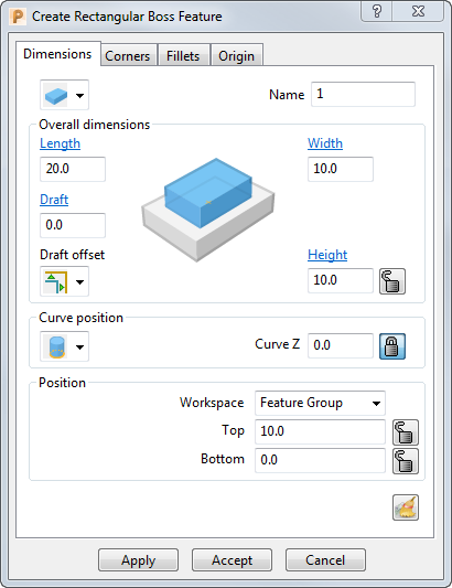 Bottom — Sets the profile curve at the bottom of the feature.Curve Z — Enter a value to specify the height of the profile curve along the Z axis. If you have specified a Draft angle, it is applied by offsetting the curve from this height.