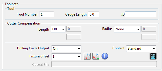 Tool Number — Enter the tool number used by the toolpath. By default this is the same as the Tool Number on the Tip tab of the Tool dialog. This is added to the cut file.