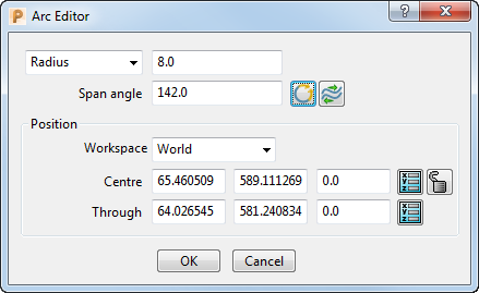 Use the Arc Editor dialog to edit an arc or circle. To display the Arc Editor dialog, double-click on an arc when the Curve Editor tab is displayed.