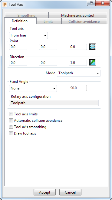 Click Toolpath Edit tab > Edit panel > Tool Axis to display the Tools axis dialog.
