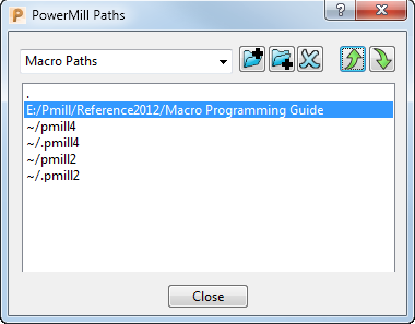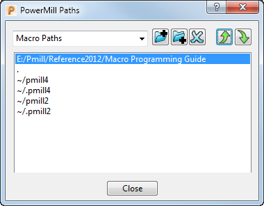 To reorder the pathnames in the macro list, select Macro Paths option from the macro menu. This displays the PowerMILL Paths dialog: