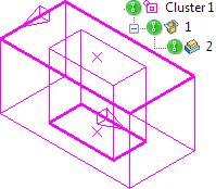 — Displays all the feature clusters at the specified Reference Z value. The Reference Z value of the cluster is calculated from the parent feature with the largest profile, this is the bottom curve for bosses and the top curve for pockets. The position of the clusters along the Z-axis is defined relative to the feature group workplane. The example below shows two feature clusters at a Z height of 0 and one feature cluster at a Z height of -5.