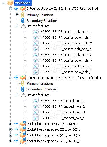 - Create a plain moldbase and use Assembly tab > Component panel > Wizard to place some screws. The example below uses four