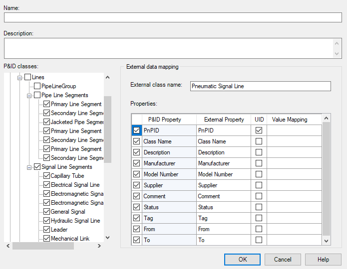 You can set up external data mapping in the Export and Import Settings dialog box when creating or modifying an export and import setting. A one-to-one mapping between every class and property is not required. Many plant objects can be mapped to the same external object.