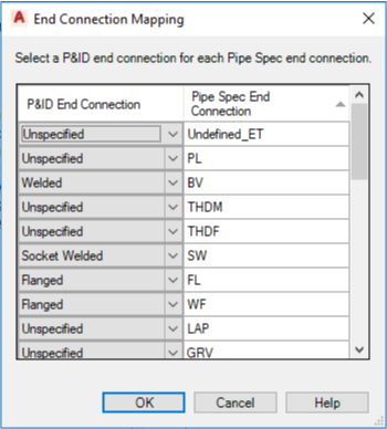 Lists the P&ID end connections available to be mapped to the Pipe Spec values.