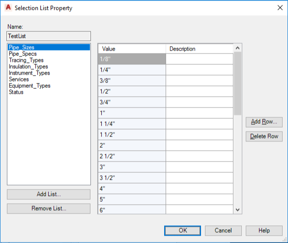Displays the Add Row dialog box, where you enter a value and description for the new entry in the selection list.