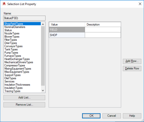 Use selection lists to enforce standard sizes for items such as pipe specs, pipe sizes, and instrument types, or when you want designers to choose from a predefined set of options.