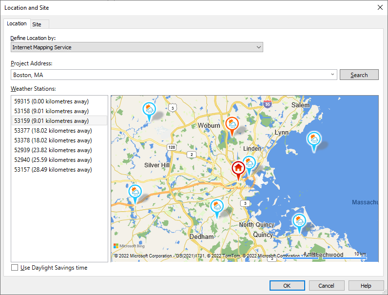 Available weather stations display in the map and in the left-hand list. In general, you should choose a weather station nearest to your location. However, you may want to choose a nearby weather station whose elevation and land or water features better reflect the model's location.