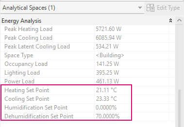 After creating the energy model, the set points in the Building Type settings are applied to the analytical spaces and display as read-only in the Properties palette.