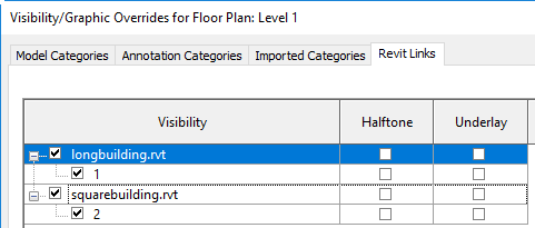 This dialog is arranged in a tree structure with the parent nodes referring to separate files (the primary linked model), and the child nodes referring to instances (copies) of the model in the project. Changing the parent node affects all instances, while changing a child node affects only that instance.