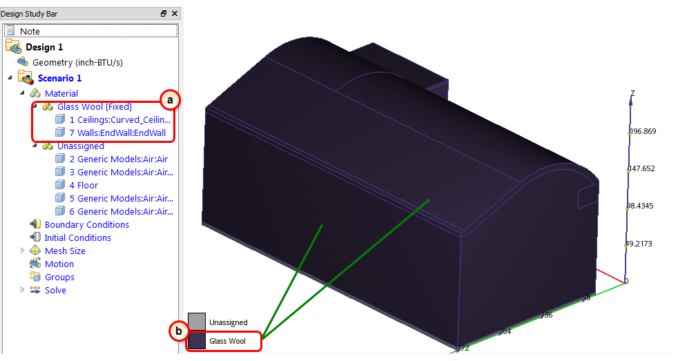 6. To verify that the Glass Wool material is properly assigned, check the Design Study Bar and the part coloring: