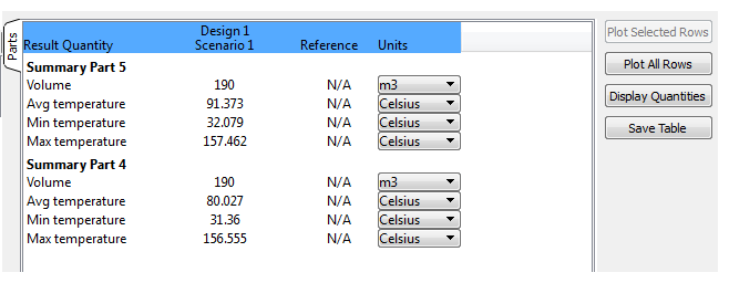 Result Parts are ideal for determining the temperatures on selected parts. To compare results from several parts, make them Summary Parts, and view their results in the Critical Values tab of the Output bar.
