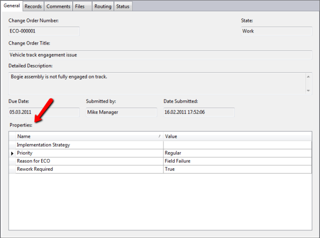 You can define properties in addition to the default properties (Change Order Number, Change Order Title, and Description, and so on). An administrator must configure additional properties before they can be used.