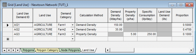 Land Use definitions are created in the Land Use Grid View of the Polygons Grid, and can be edited in the grid or on the Land Use Property Sheet.
